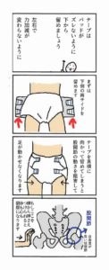 おむつの中心を背骨にあてて、腰の中心から左右におむつを伸ばし、腰の下におむつを
